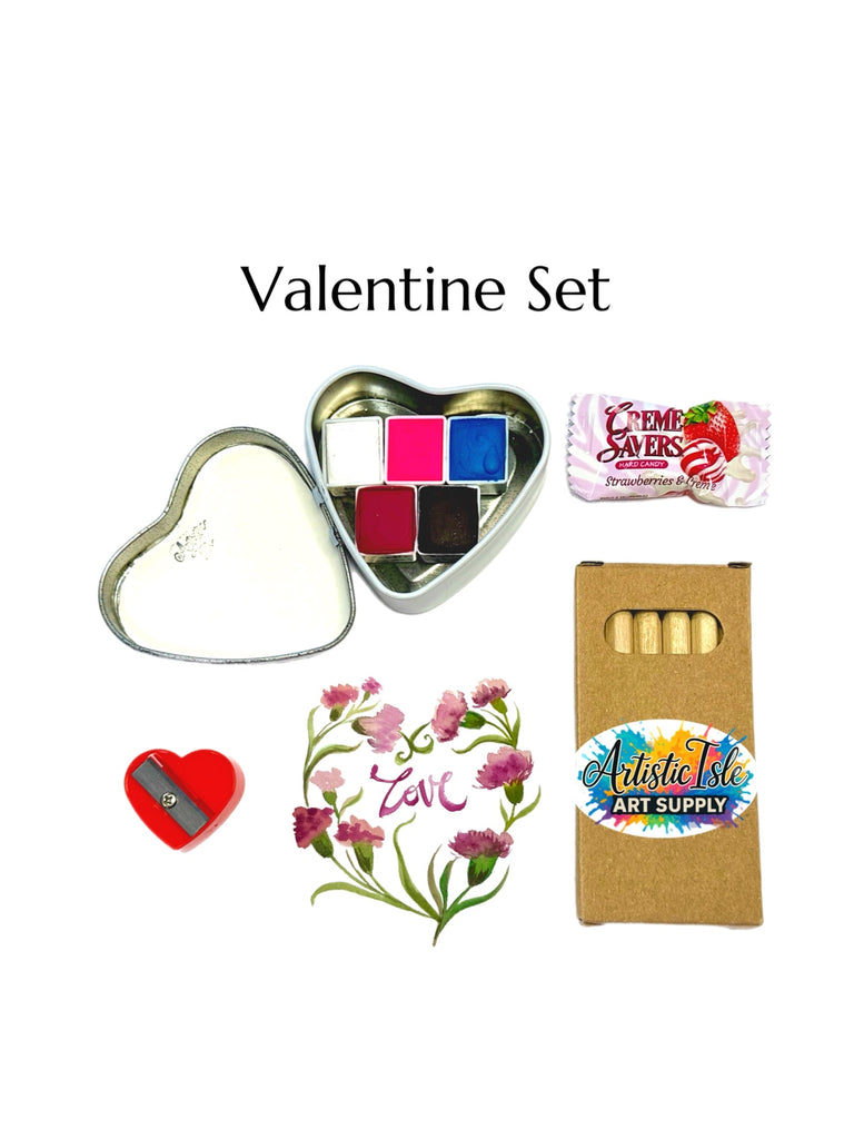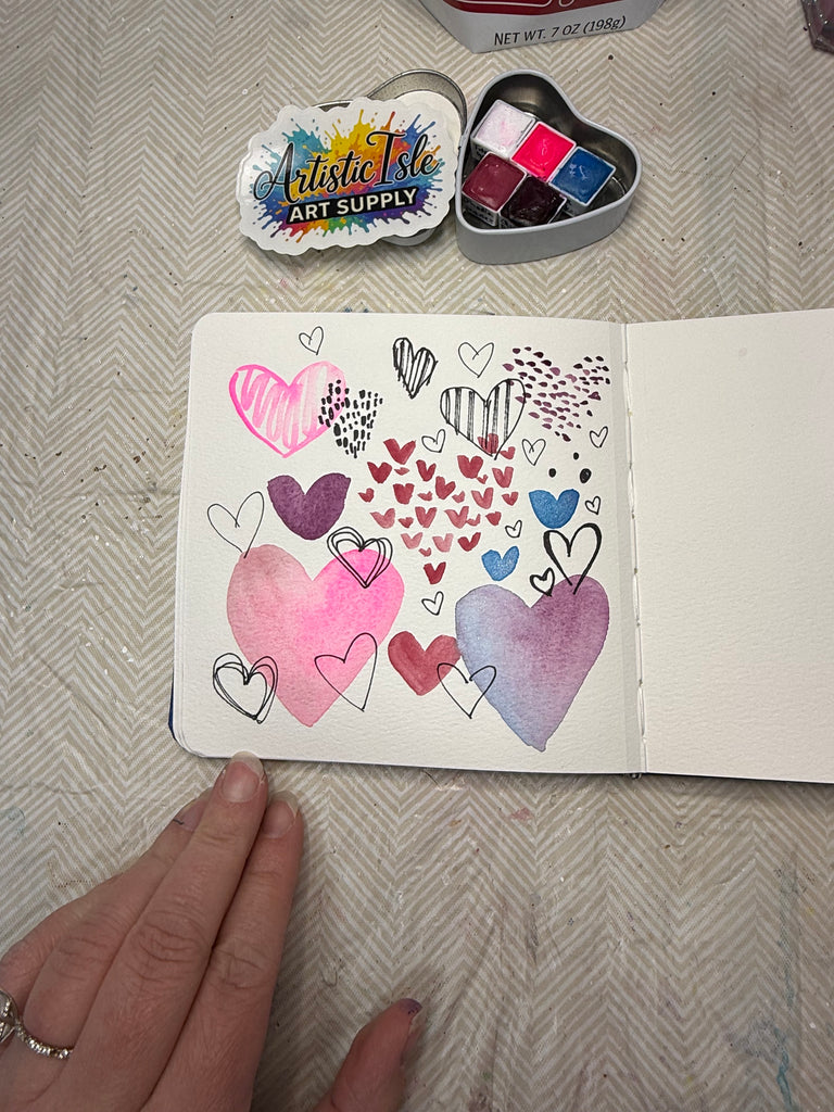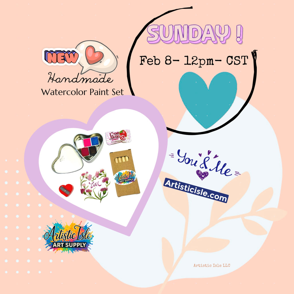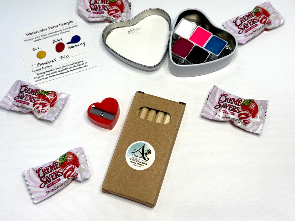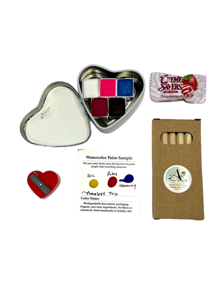 Nestled inside a charming heart-shaped tin, you’ll find five artisan, handmade watercolor half pans, each poured by hand and designed to inspire joyful painting moments—whether you’re a beginner or a seasoned artist.